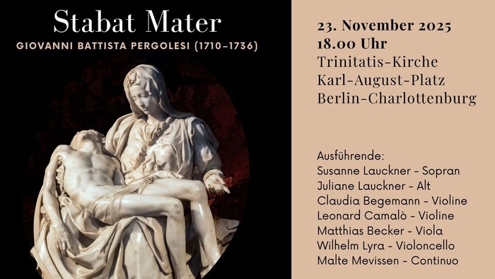 Am Abend des Ewigkeitssonntages, 23. November 2025, erklingt das Stabat Mater von Giovanni Battista Pergolesi in der Trinitatiskirche.