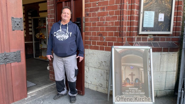 Mittwoch, der 1. Oktober, ist ein normaler Markttag auf dem Karl-August-Platz. Die Kirchentüren sind geöffnet, Besucher haben Kerzen angezündet. Markus Peter hat das Licht angemacht, heißt die Eintretenden willkommen, zeigt den Weg zur Toilette und zum Wickeltisch.